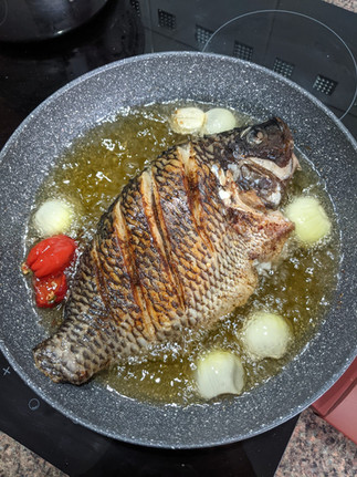 👩🏾🍳 Heat about 2.5 cm of oil in a large pan over medium to high heat, once hot add the fish to the oil and fry for about 7 to 10 minutes on each side depending on fish size and how crispy you like your fish. For additional seasoning, I added onion and a chilli to the oil and these will infuse into the fish while cooking.